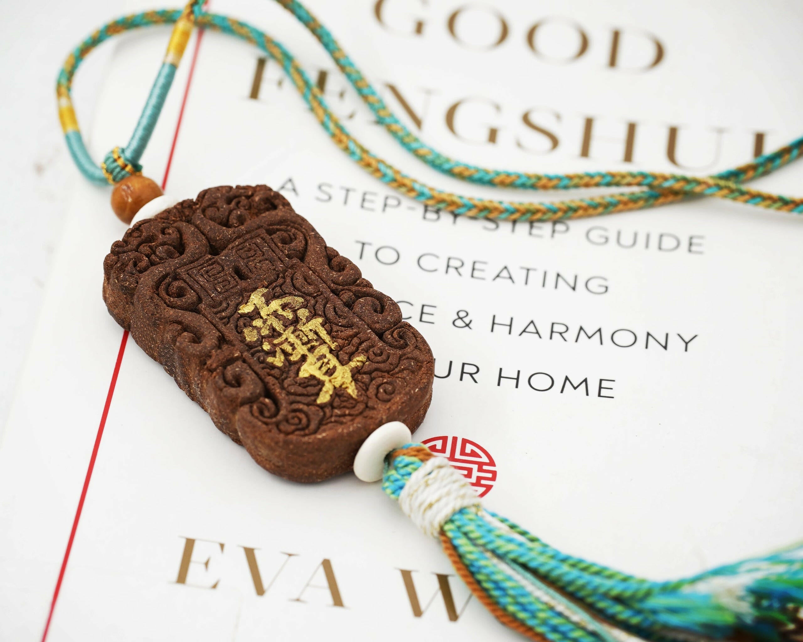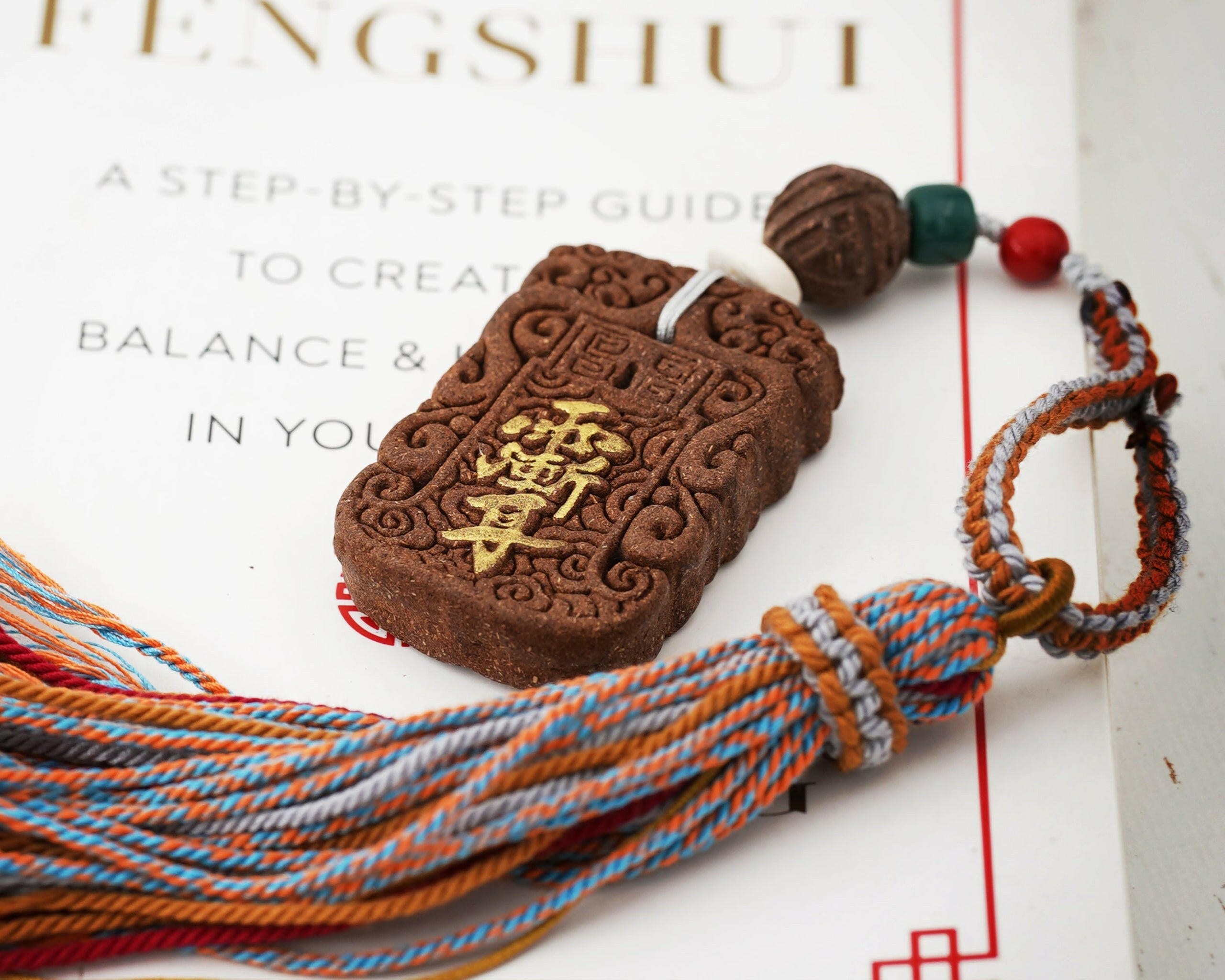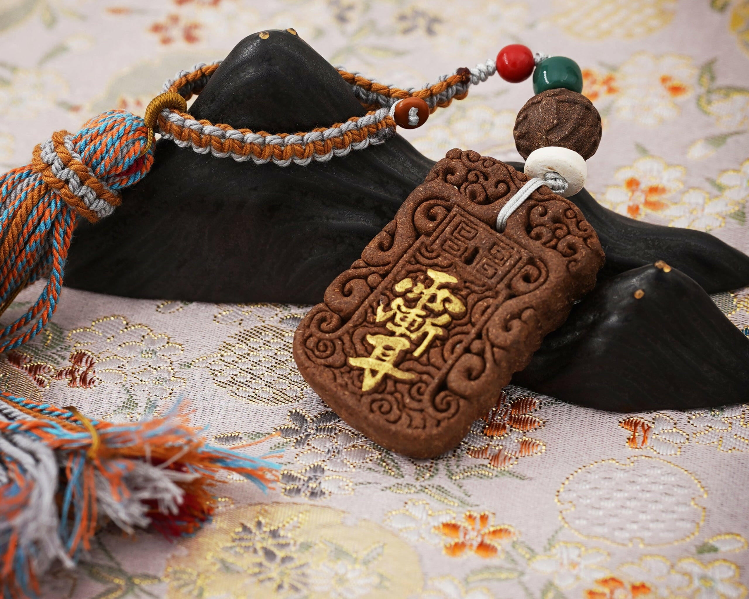 This artisanal fragrance amulet is meticulously crafted through a traditional process: grinding Osmanthus flowers, Agarwood, Sandalwood, Lemongrass Herb, Clove, and Benzoin into fine powder, then kneading, molding, and air-drying. Every step – including the braiding of colored cords – is done entirely by hand, making each piece a unique work of craftsmanship.